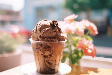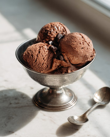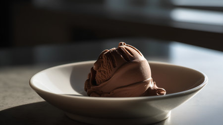 melting scoop of chocolate ice cream with spoon resting beside, natural morning kitchen light casting soft shadow v 7, Generative AI
