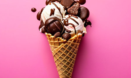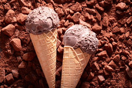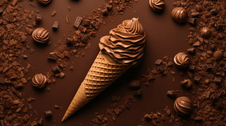 Experience the indulgence of rich chocolate ice cream served in a waffle cone, surrounded by flying chocolate pieces that capture the essence of dessert bliss.