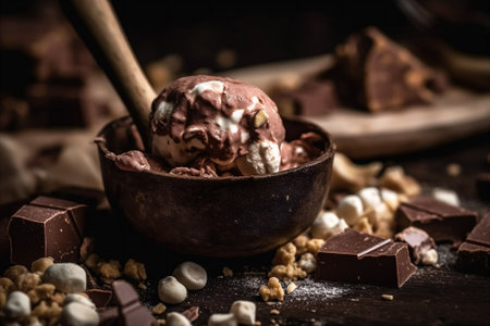Close up shot of scoop of rocky road ice cream studded with chunks of chocolate, marshmallows and almonds, drizzled with chocolate syrup. AI generated