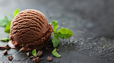 Close-up of chocolate ice cream scoop with fresh mint leaves