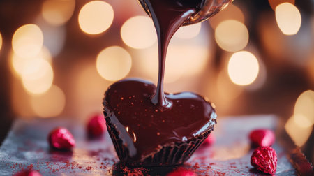 Heart-shaped chocolate dessert with glossy ganache, adorned with red berries, creates a romantic atmosphere perfect for celebrations and sweet indulgence.