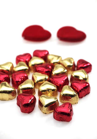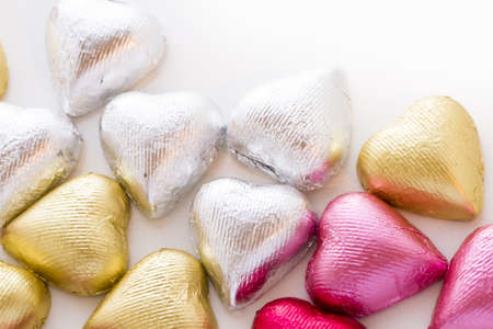 Heart shape chocolate candies wrapped in colorful foil for Valentine's Day.