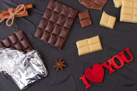 Romantic background with chocolate bars. Different chocolate pieces and inscription I love you on black background.