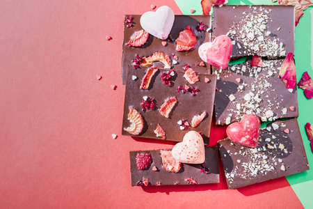 Homemade natural chocolate with strawberry, and freeze dried raspberries, chocolate heart on colored background top view. Valentine's day, chocolate day.
