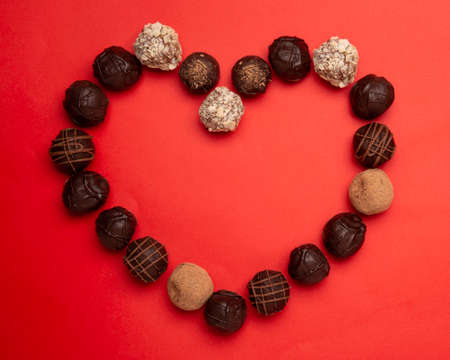 love concept image of heart shape made of chocolate truffles on red paper texture background