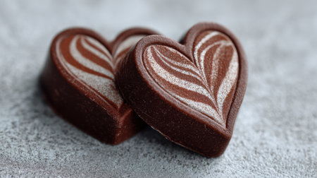 Two beautifully crafted chocolate hearts with intricate swirls sit on a gray surface, perfect for conveying love, celebration, and sweet indulgence in any project.