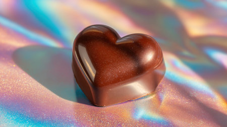 A single heart-shaped chocolate sits on a shimmering iridescent surface, perfect for romantic gifts and celebrations. Ideal for Valentine's Day or sweet indulgences.