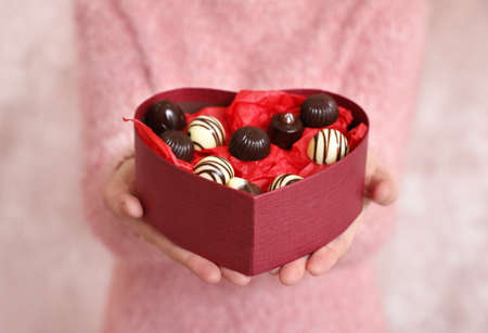 Delicious chocolate pralines in red box for Valentine's Day. Heart shaped box of chocolates top view with copy space.