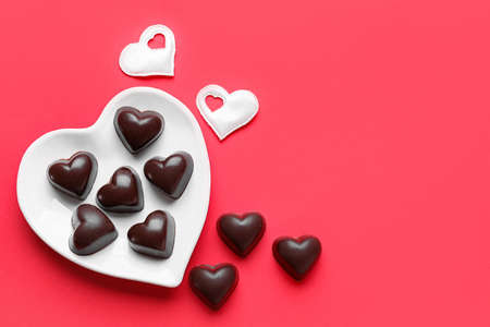 Sweet delicious sweets in the form of chocolate hearts in a white saucer. Celebrating Valentine's Day