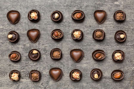 Dessert, confectionery and gluten-free organic food concept - Sweet swiss chocolate candies on a stone tabletop, flatlay