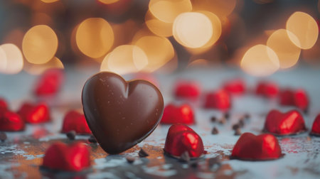 A chocolate heart amidst red candy wrappers on a reflective surface with warm bokeh lights.
