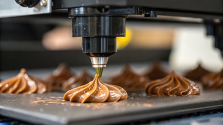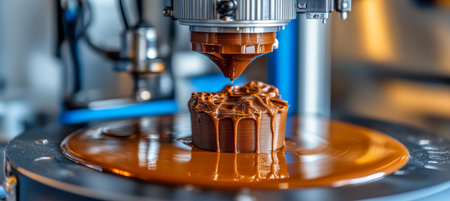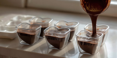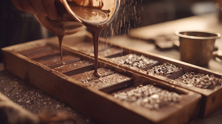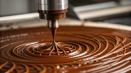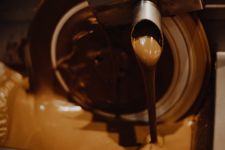 hot molten chocolate is poured into a tray in a confectionery factory, close-up