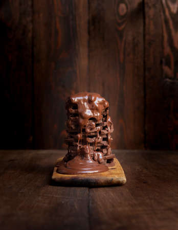 Melted hot chocolate dripping over a pile of chocolate bars on a rustic wooden table