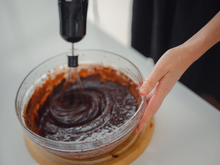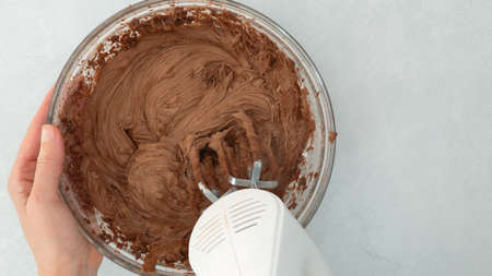 Chocolate buttercream frosting, mixing ingredients in glass bowl using an electric mixer, flat lay with copy space