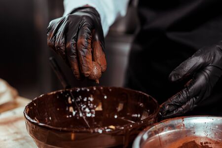 cropped view of chocolatier in black latex glove holding chocolate ball near bowl with melted chocolate