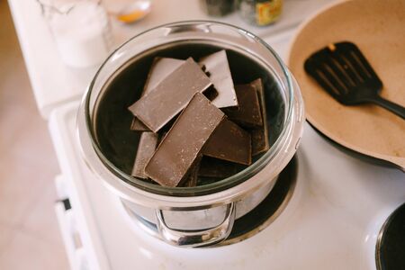 Chocolate bars are melted in a glass bowl on a steam bath.