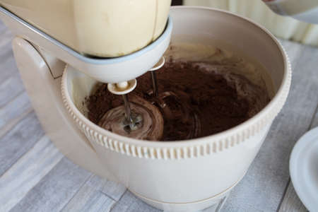 Cake making process. All ingredients are added to the mixer bowl. The dough is kneaded with whisk. Step by step recipe for chocolate cake. Series. Baking concept.