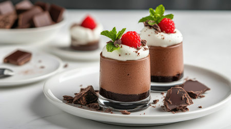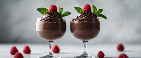 AI Generated. Two Glasses of Chocolate Mousse with Raspberries and Mint