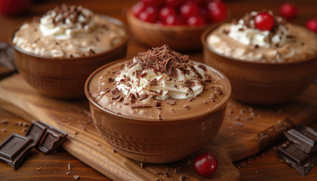 Indulgent Gourmet Chocolate Mousse Desserts Elegantly Served in Charming Bowls with Whipped Cream