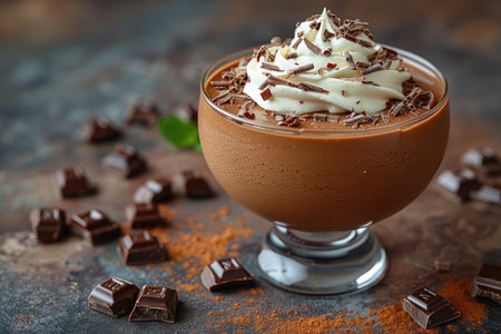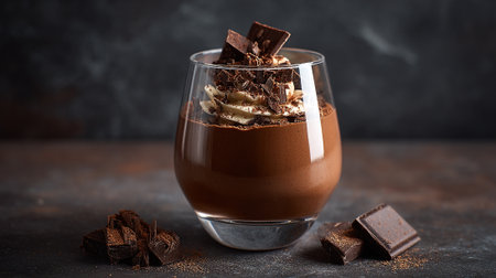 Decadent mousse au chocolat in glass with cocoa powder splash for dessert delight