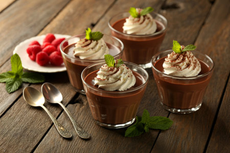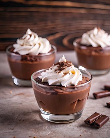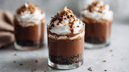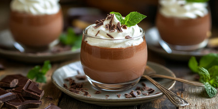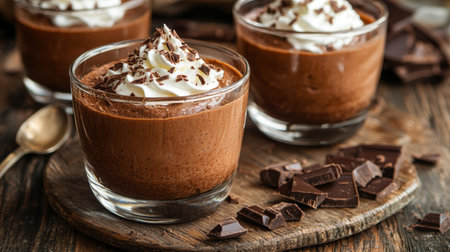 Decadent Chocolate Mousse Dessert Served in Elegant Glasses Topped with Whipped Cream and Shavings