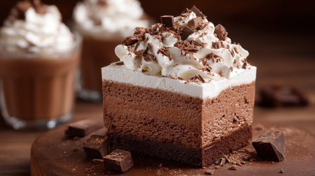 A rich chocolate mousse cake topped with fluffy whipped cream and chocolate shavings delights.