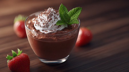 A luxurious chocolate mousse in a glass cup, garnished with a sprinkle of cocoa and a fresh mint leaf, set against a white background for a refined and appetizing look.