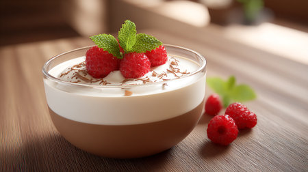A delectable dessert featuring layers of white cream and chocolate mousse is adorned with fresh raspberries and a sprig of mint. The dessert is served beautifully in a glass.