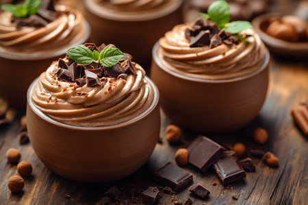 Rich chocolate mousse served in rustic bowls garnished with fresh mint leaves and chopped chocolate pieces. accompanied by whole hazelnuts and chocolate shavings on a textured wooden surface, creating a luxurious dessert setting. Generative AI
