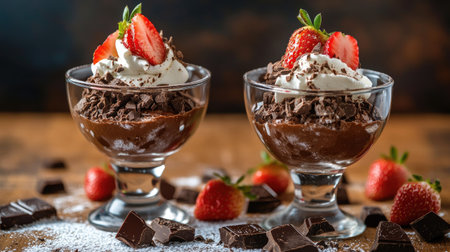 Close-up of two chocolate desserts in elegant glasses with fresh strawberries and whipped cream, surrounded by chocolate pieces and powdered sugar.