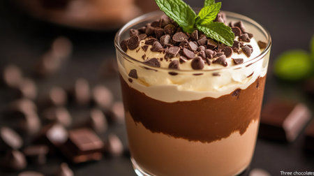 Close-up shot of a delicious layered Three chocolates mousse in a glass, garnished with fresh mint leaves and sprinkled with chocolate chips