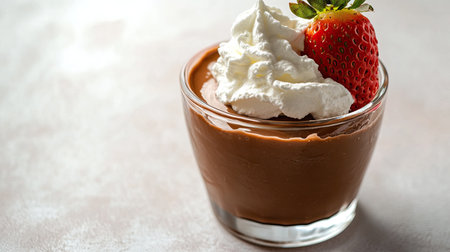 Creamy chocolate pudding in a glass container, topped with a fresh strawberry and whipped cream, with a bright white background to emphasize its smooth texture