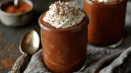 A sumptuous chocolate mousse served in a clear glass jar, topped with fluffy whipped cream and cocoa dust, perfect for dessert lovers and culinary enthusiasts.