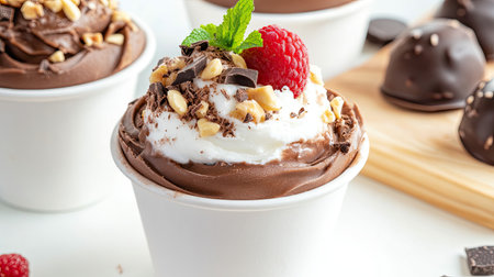A tempting chocolate dessert cup topped with creamy layers, fresh raspberries, nuts, and mint. Perfect for any sweet occasion or celebration!