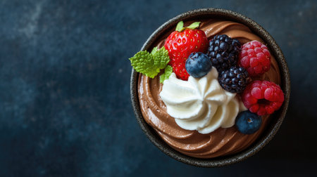 Overhead view of a scrumptious chocolate mousse with whipped cream and berries