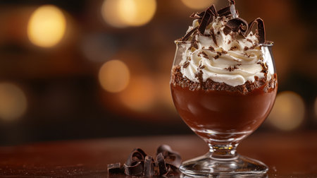 Indulge in a decadent chocolate mousse topped with whipped cream, elegantly presented in a clear glass against a glowing bokeh backdrop in a lavish setting.