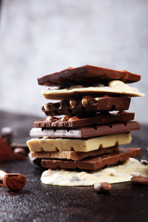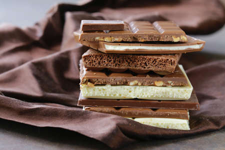 Variety of chocolate bars. Heap of dark, milk, pink chocolate and chocolate with fruits and nuts. Sweet food background.