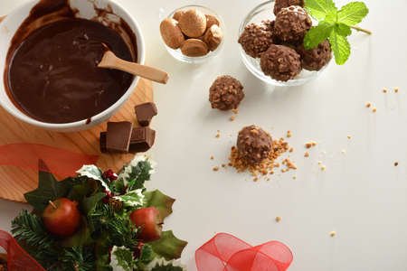 composition on a white wooden background handmade chocolate candies in the style of Raphael from organic natural products, cinnamon, walnuts, cashews, almonds