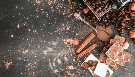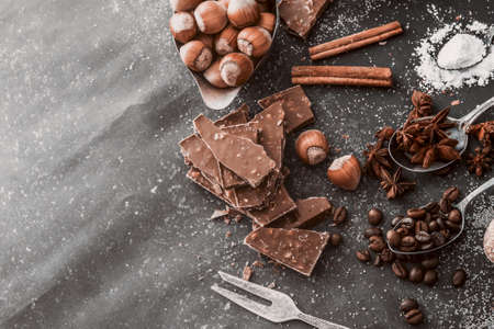 Black and milk chocolate, sweets, dried citrus fruits, coffee beans and spices on the table, top view, home cooking, sweet food