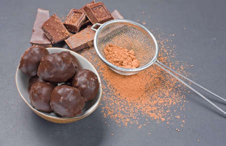 Chocolates, Cocoa Powder and pieces of chocolate on a dark background