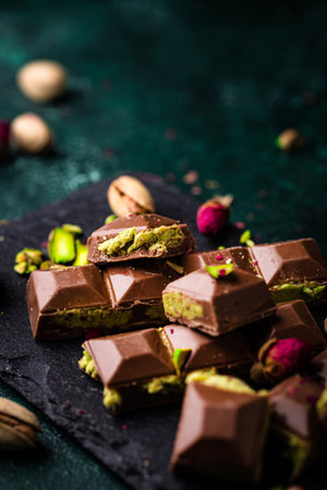 Stack of pieces of chocolate filled with white nougat on a dark stone table, copy space