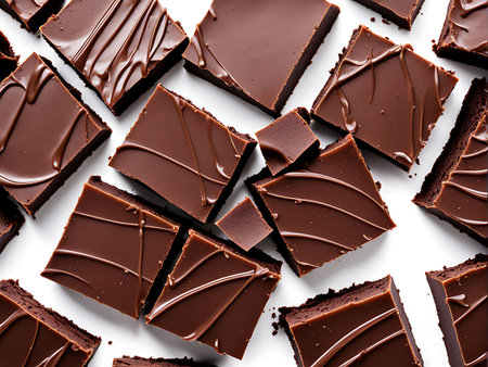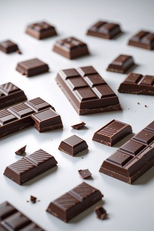 A collection of rich, dark chocolate squares scattered on a clean, white background, showcasing the texture and appeal of the chocolate.