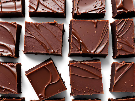 A close-up view of rich, decadent chocolate brownies arranged in a scattered pattern, showcasing their moist texture and glossy tops. Ideal for dessert lovers and baking enthusiasts.