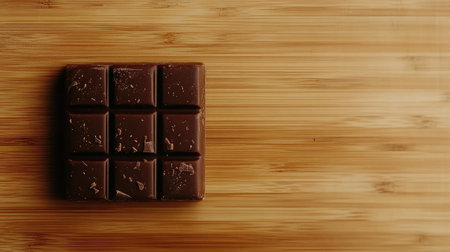 A minimalist chocolate background with a single, glossy piece of dark chocolate placed on a matte, dark surface, with soft reflections adding a touch of elegance.