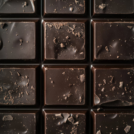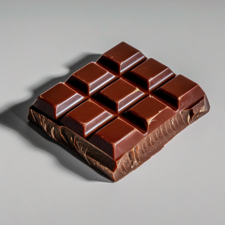 A luxurious dark chocolate block showcases glossy segments on a neutral background, highlighting its rich texture and tempting sheen, perfect for food lovers.