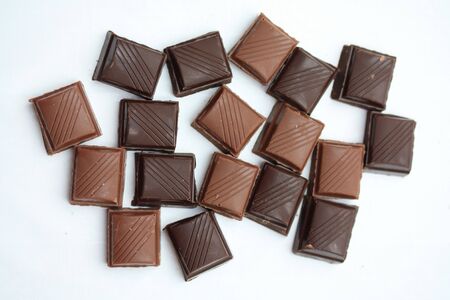 Chocolate pieces on a white background. Chocolate bar. Sweet food.