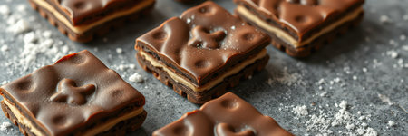 close up of chocolate bars with chocolate glaze, shallow dof AI Generated