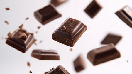 A stunning visual of dark chocolate pieces suspended in mid-air, showcasing smooth textures and rich colors that evoke indulgent cravings.