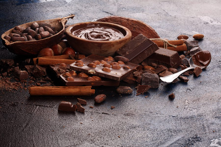 Chocolate bar pieces and melting swirl cocoa. Sweet food photo concept. The chunks of broken chocolate on rustic background with nuts and spices