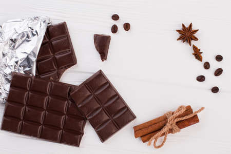 Dark chocolate bars, coffee beans and cinnamon. Chocolate pieces, spices and copy space.